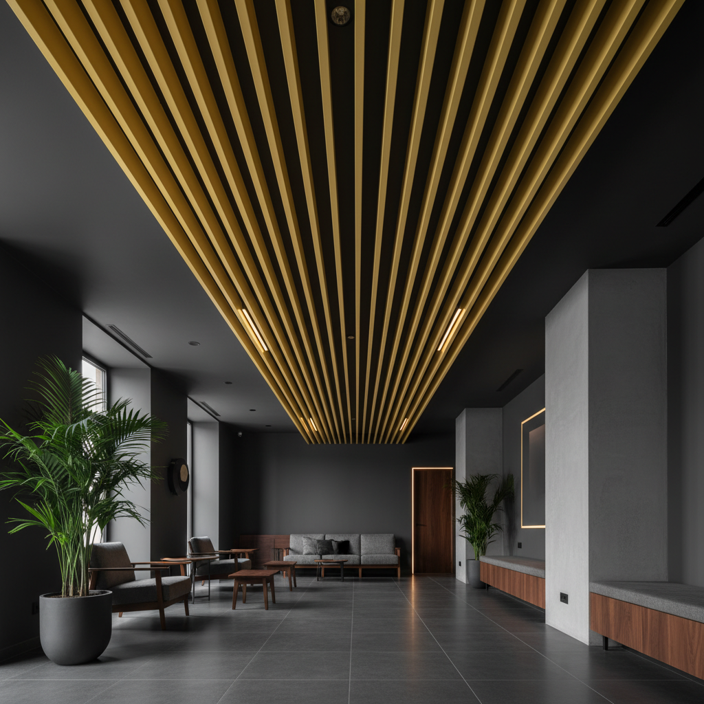 Об’ємний модульний ритм кубоподібної стелі з цим тоном підсилює глибину стелі, формує чіткі лінії та допомагає будувати перспективу. Відтінок RAL 1037 гармонійно поєднується з нейтральними мінеральними фактурами, теплим деревом і темними металами, забезпечуючи благородний контраст і чисту графіку.