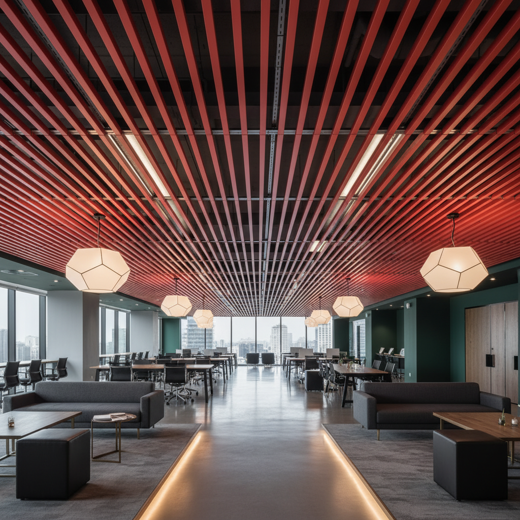 Кубоподібна Стеля у відтінку RAL 3016 створює впевнений, сучасний настрій з теплим, майже теракотовим відтінком, що робить комерційні інтер’єри більш гостинними та структурованими. Чіткий кубічний профіль формує ритм і глибину стелі, допомагаючи візуально зонувати простір без перевантаження.