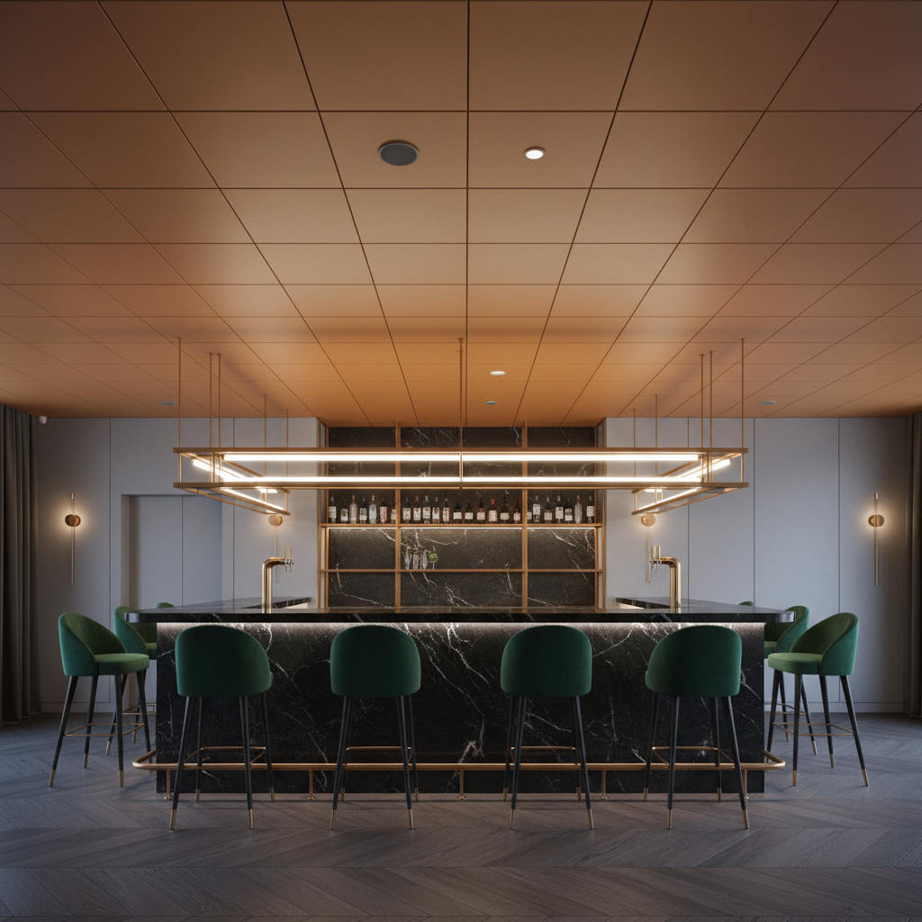 У громадських і житлових просторах цей тон працює як спокійний акцент, що гармонійно контактує з бетоном, світлими та білими площинами, натуральним деревом і темними металами. На стелі створює виразну графіку тіней без візуального перевантаження, допомагає виділити функціональні зони і підтримати нейтральну палітру.
